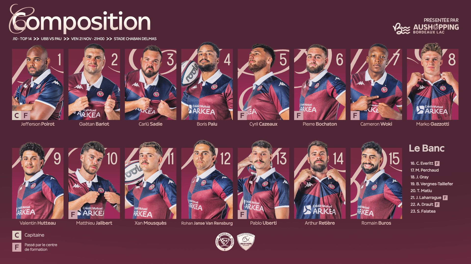 Après deux semaines de pause dues aux Nations Series, le TOP 14 fait son retour ce vendredi soir à Chaban avec la réception de la Section Paloise. Voici la composition de l’équipe :