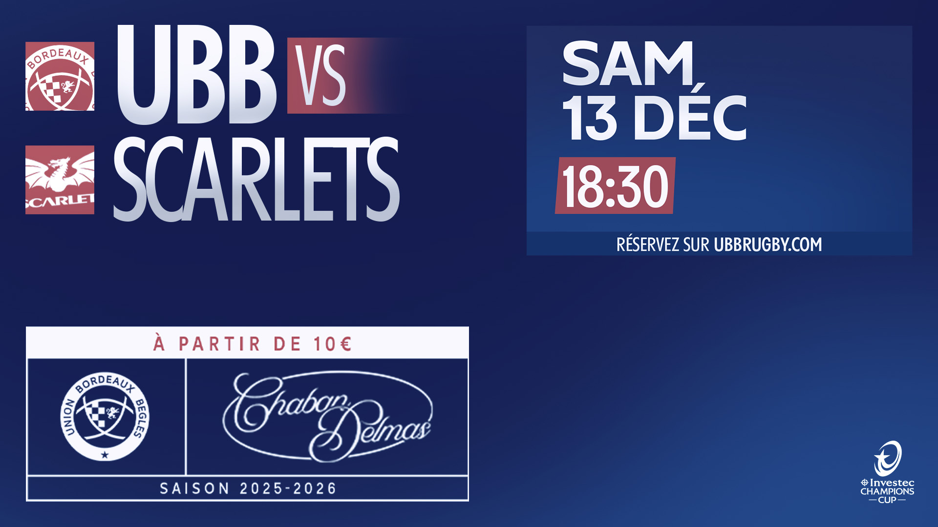 Pour cette 2e journée de Champions Cup, l'UBB reçoit les gallois des Scarlets ce samedi à 18H30. Avant-match, buvettes, boutiques... retrouvez toutes les infos à connaître sur la rencontre dans notre article :