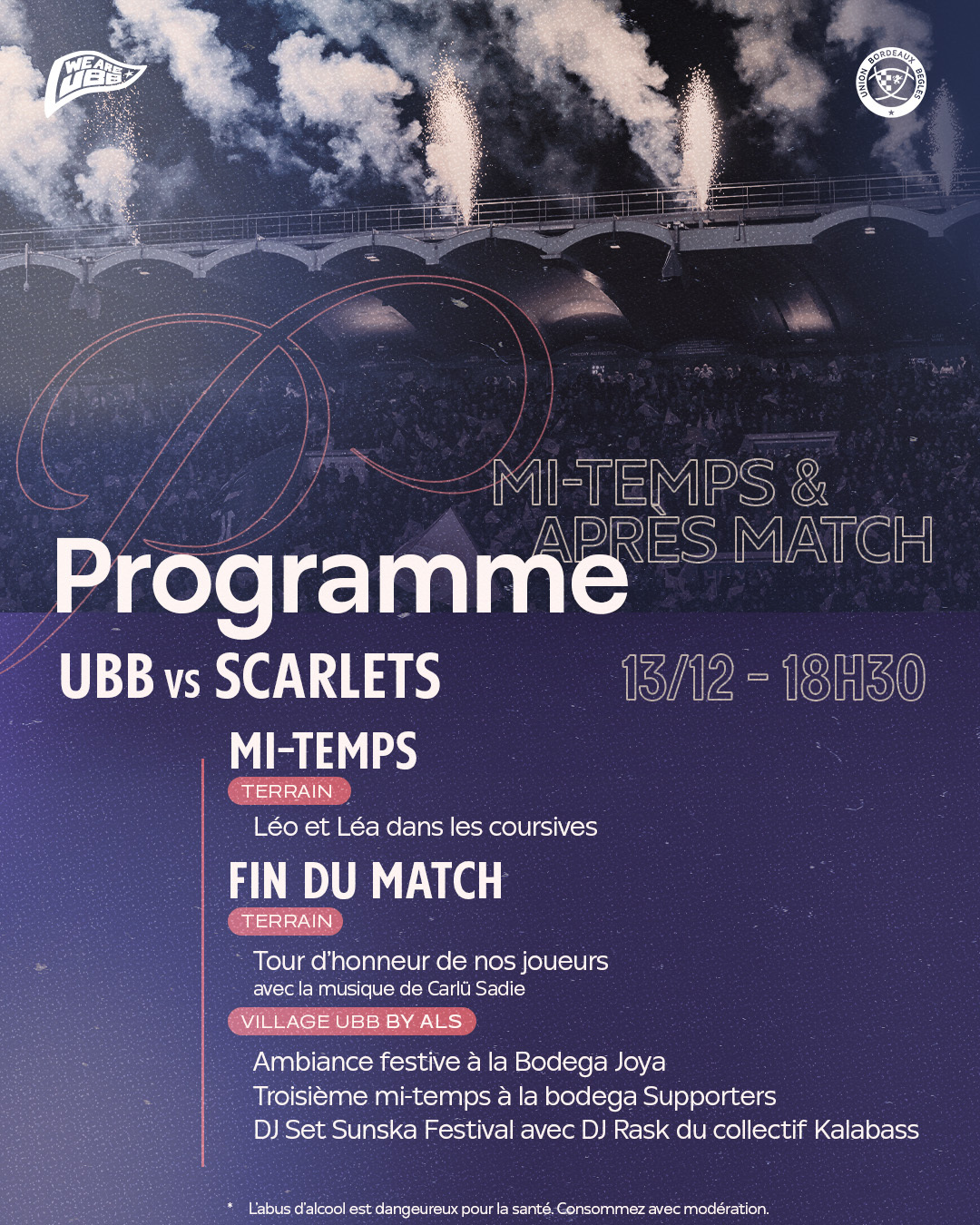 Le bus de l'UBB déposera les joueurs Place Johnston autour de 16h45, pour qu'ils parcourent les derniers mètres au plus proche de vous, avec speaker et DJ à partir de 16h30. Venez partager ce moment privilégié !