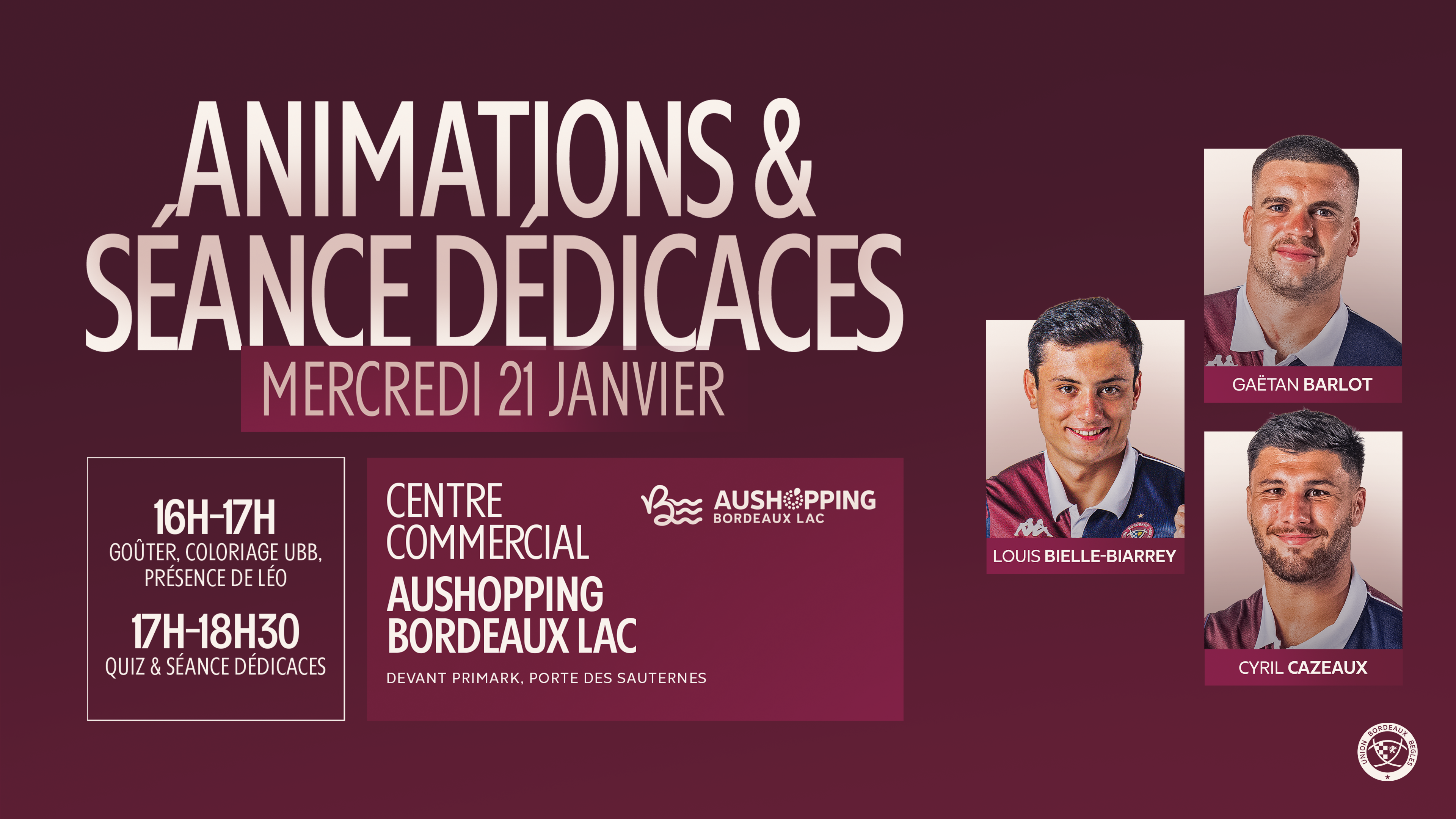 Le Centre Commercial Aushopping de Bordeaux Lac organise, en collaboration avec le club de l'UBB, une séance de dédicaces le mercredi 21 janvier prochain en compagnie de Louis Bielle-Biarrey, Gaëtan Barlot et Cyril Cazeaux, de 16h à 18h30.