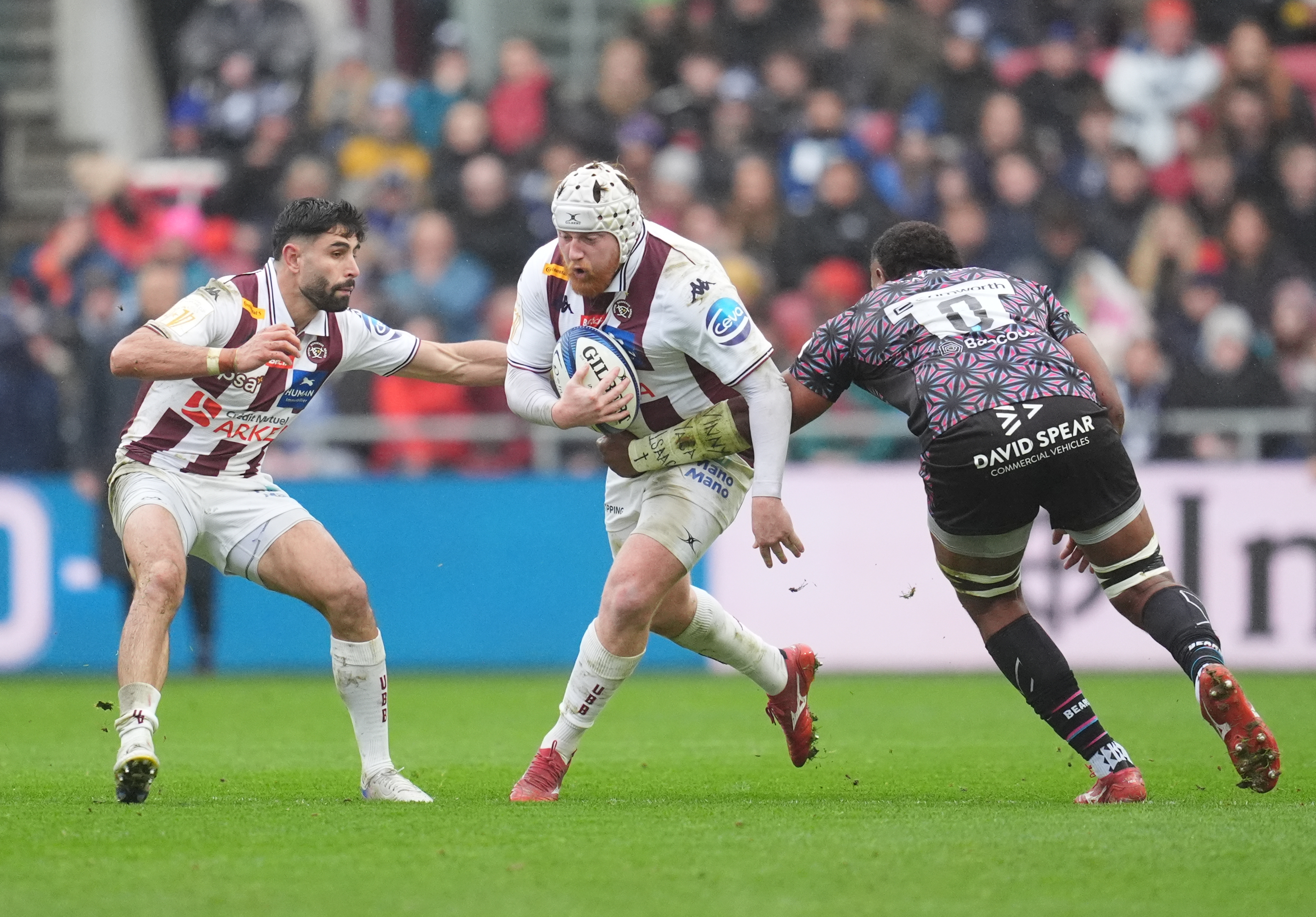 Nos girondins avaient à coeur de finir en beauté cette phase poule et malgré une météo 100% brithish, le match débutait par une belle séquence de possession de nos Girondins, qui tentaient de marquer mais s'heurtaient à une bonne défense anglaise. Ce sont finalement les locaux qui ouvraient le score. L’ancien girondin Gabriel Oghre marquait en force au ras d'un ruck après une pénalité jouée rapidement et Bristol inscrivait les premiers points de la rencontre (10e ; 5-0).