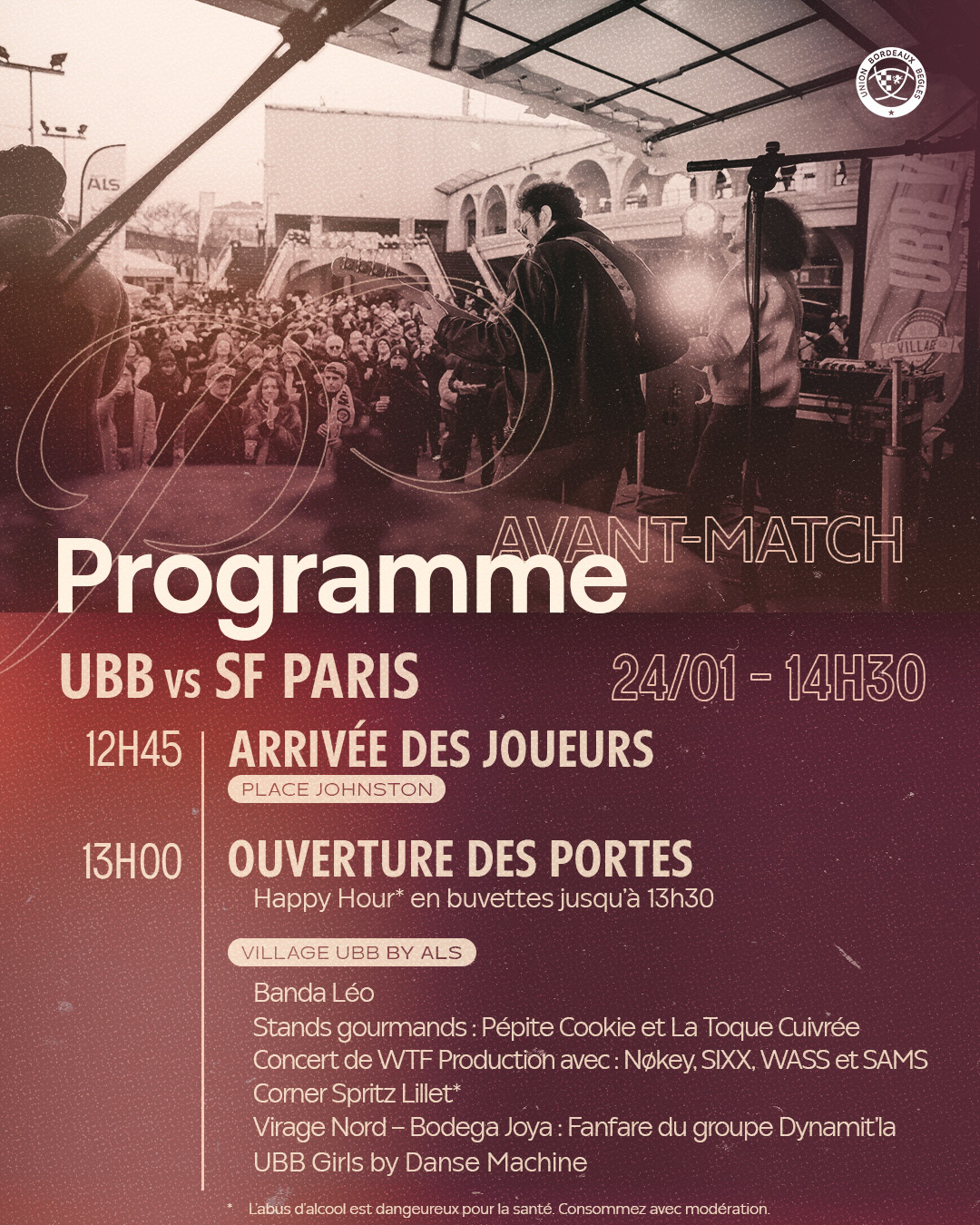 Pour cette 15e journée de TOP 14, l'UBB reçoit le Stade Français ce samedi à 14h30 au stade Chaban-Delmas. Avant-match, buvettes, boutiques... retrouvez toutes les infos à connaître sur la rencontre dans notre article :