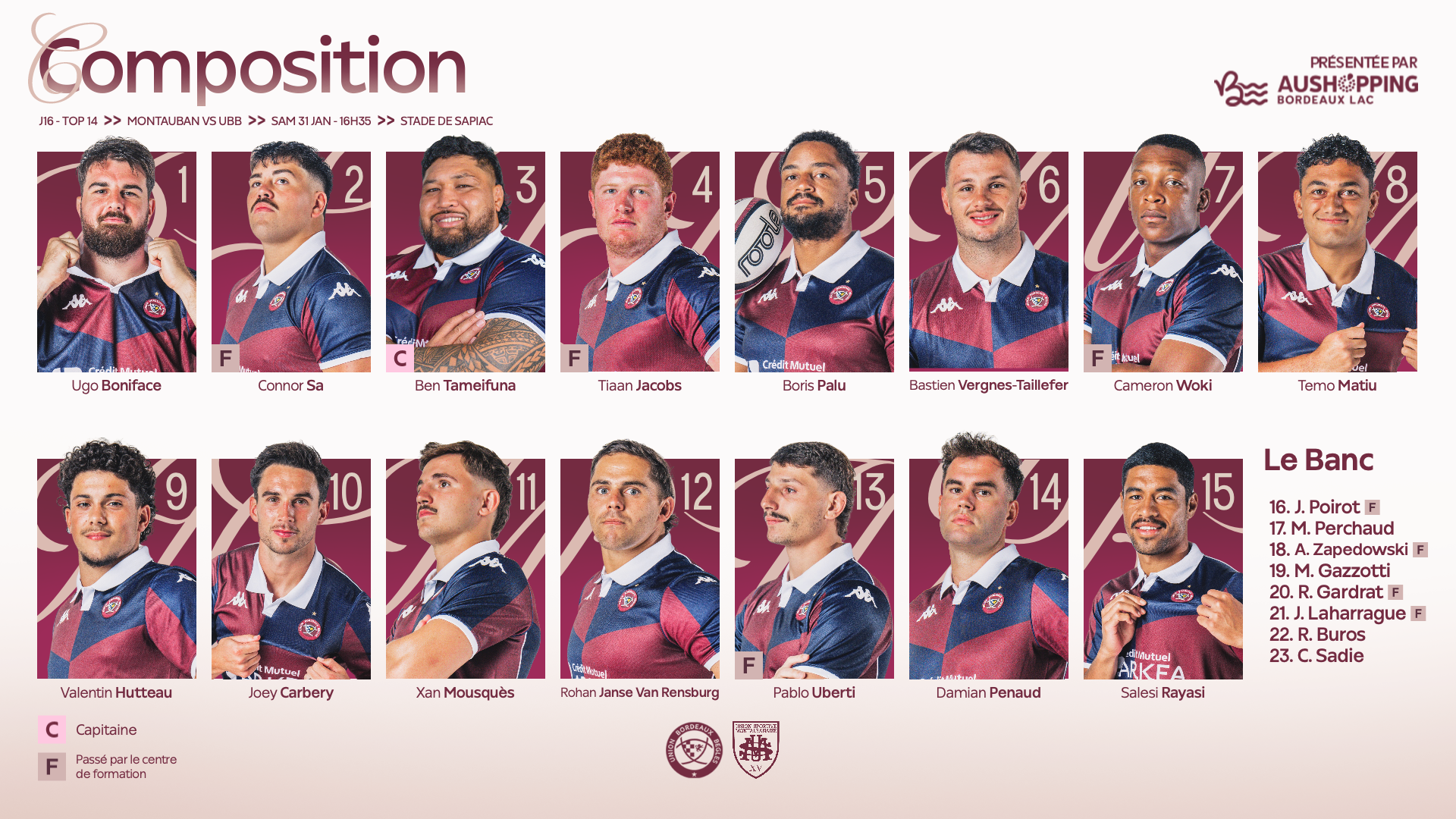 Pour rappel l'UBB est "privée" de 5 joueurs retenus en équipe de France : Lamothe, Jalibert, Bielle-Biarrey, Depoortere et Moefana.