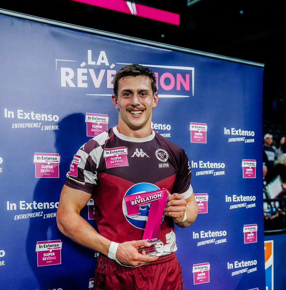 Le capitaine, Nathan Gagnac, soulève le premier trophé de Champions de France de l'UBB Sevens