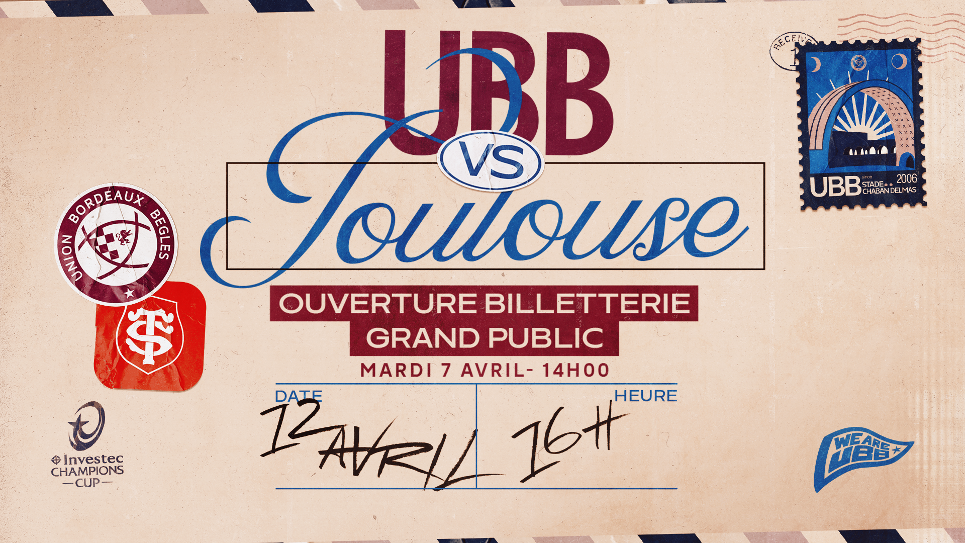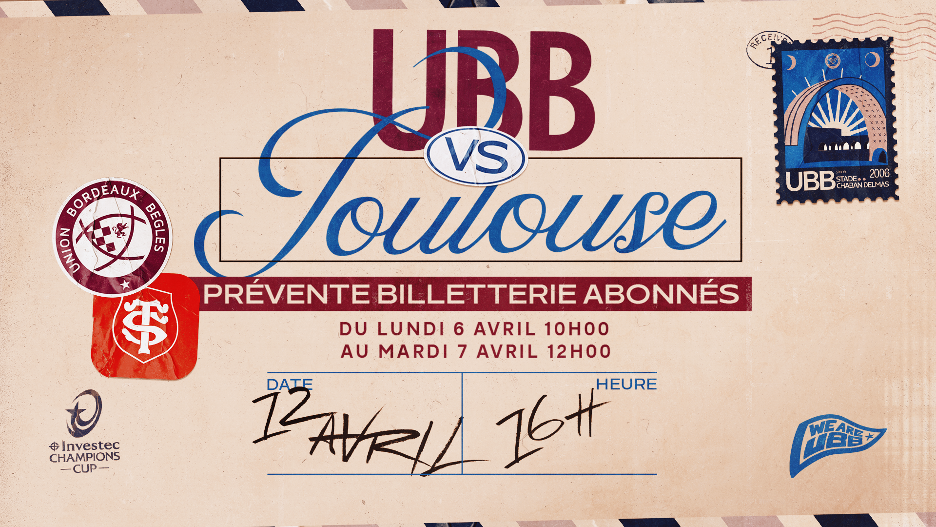 Dimanche 12 avril prochain à 16h00 l'UBB recevra Toulouse à Chaban en quart de finale d'Investec Champions Cup. Pour l'occasion, une prévente réservée à nos abonnés, ouvrira dès demain, à 10h00. Une vente au grand public aura ensuite lieu à partir du mardi 7 avril à 14h00, sous réserve de places disponibles.
