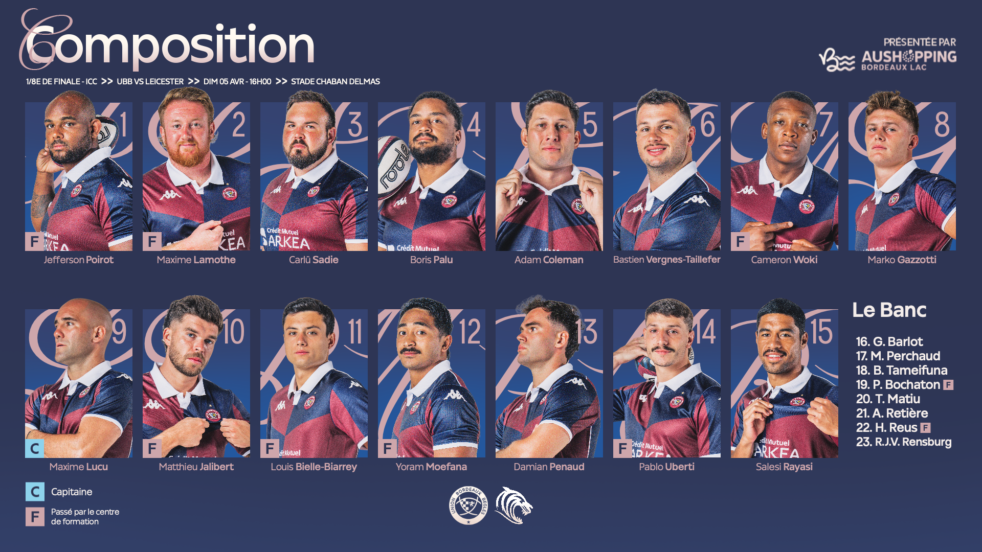 Premier match de phase finale ce week-end pour nos Girondins qui reçoivent les Leicester Tigers en 1/8 de finale de Champions Cup ce dimanche 5 avril à 16h00. Découvrez la composition de votre équipe :