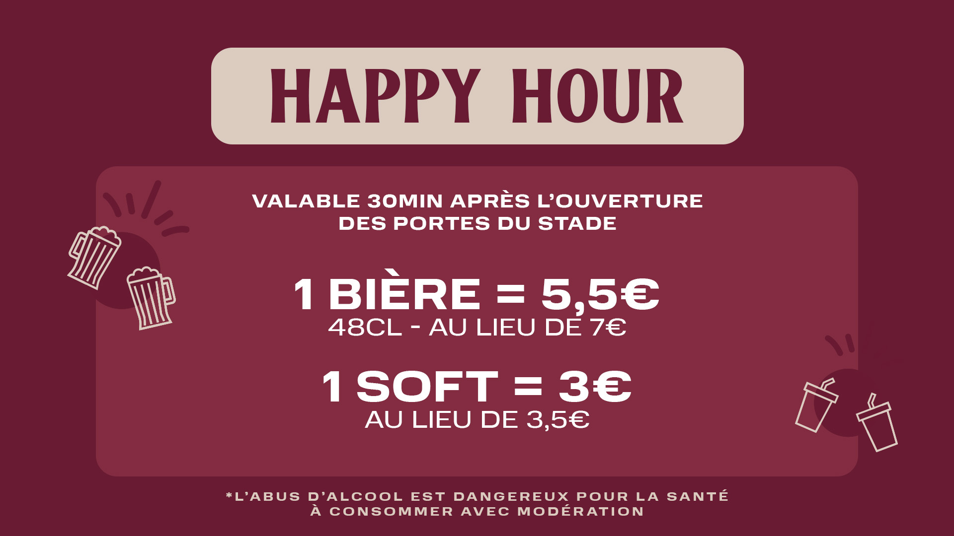 Profitez également de notre Happy Hour de 19h00 à 19h30 dans toutes nos buvettes ainsi que dans nos Bodegas Supporters en Virage Nord pour partager un moment convivial !
