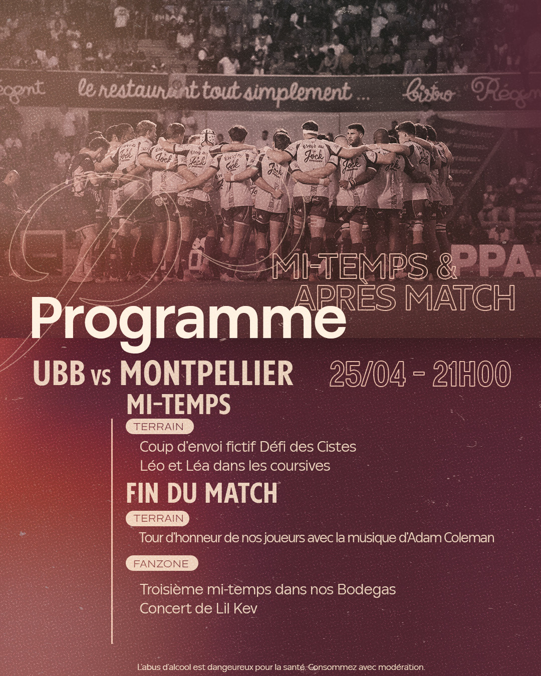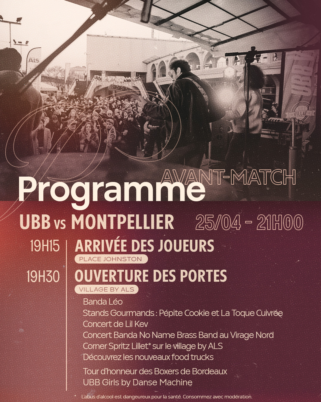 Le bus de l'UBB déposera les joueurs Place Johnston autour de 19h15, pour qu'ils parcourent les derniers mètres au plus proche de vous, avec speaker et DJ à partir de 19h00. Venez partager ce moment privilégié !