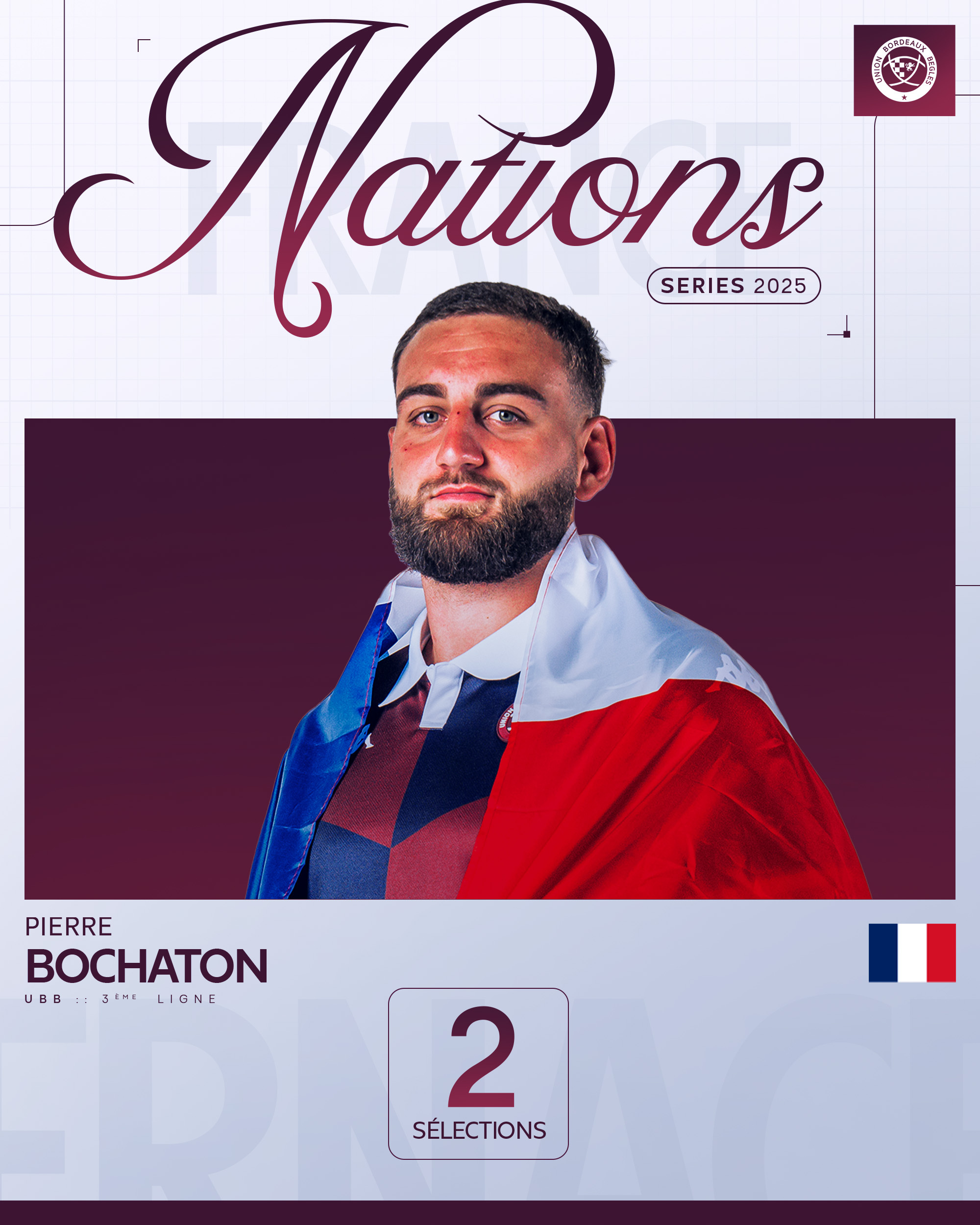 La Fédération Française de Rugby a convoqué ce jour notre 3e ligne Pierre Bochaton pour le stage de préparation au Quilter Nations Series. Il vient remplacer le montpelliérain Lenni Nouchi forfait et rejoindra Marcoussis ce lundi avec ses 6 autres coéquipiers girondins.